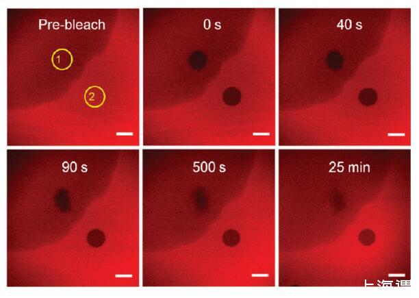 圖4。界面層光漂白后的熒光恢復。ROI(黃色圓圈)是選定的光漂白區(qū)域。ROI-1位于富含表面活性劑的區(qū)域,而ROI-2位于富含HSA TR的區(qū)域。初始亞相濃度為[HSA-TR]=0.10 mg/mL和[F-127]=0.0050 mg/mL。比例尺:20μm。
