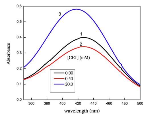 圖5.[CET]對(duì)水性甲酚紅染料可見光譜的影響:(1)[CET]=0mm,(2)[CET]=0.50mm,(3)[CET]=20mm。[CR]=3×10?5毫米。