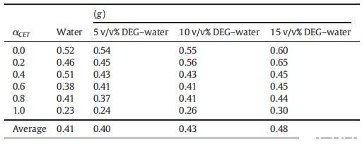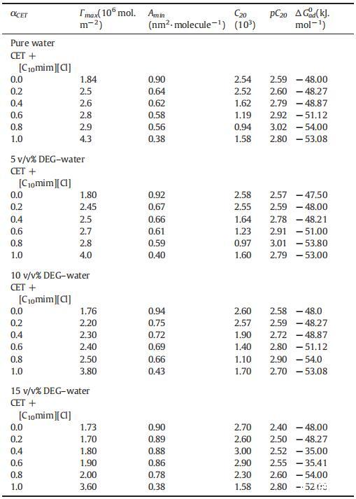 表4純CET、[C10min][Cl]和CET+[C10min][Cl]混合物的表面過(guò)剩(Γmax)、每分子最小面積(Amin)、吸附效率(pC20)和吸附自由能(ΔGad 0),作為純水中CET摩爾分?jǐn)?shù)α的函數(shù),并且在T=298.15K時(shí)存在不同體積百分比的二元DEG-水混合物。