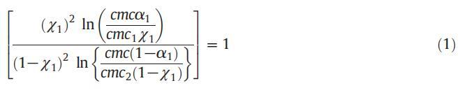 應(yīng)用正規(guī)溶液理論,可以計(jì)算混合膠束中表面活性劑分子之間的相互作用參數(shù)(β)值,從而提供表面活性劑分子之間相互作用強(qiáng)度的信息。借助正規(guī)溶液理論(RST),膠束摩爾分?jǐn)?shù)也可以使用魯賓方程計(jì)算: