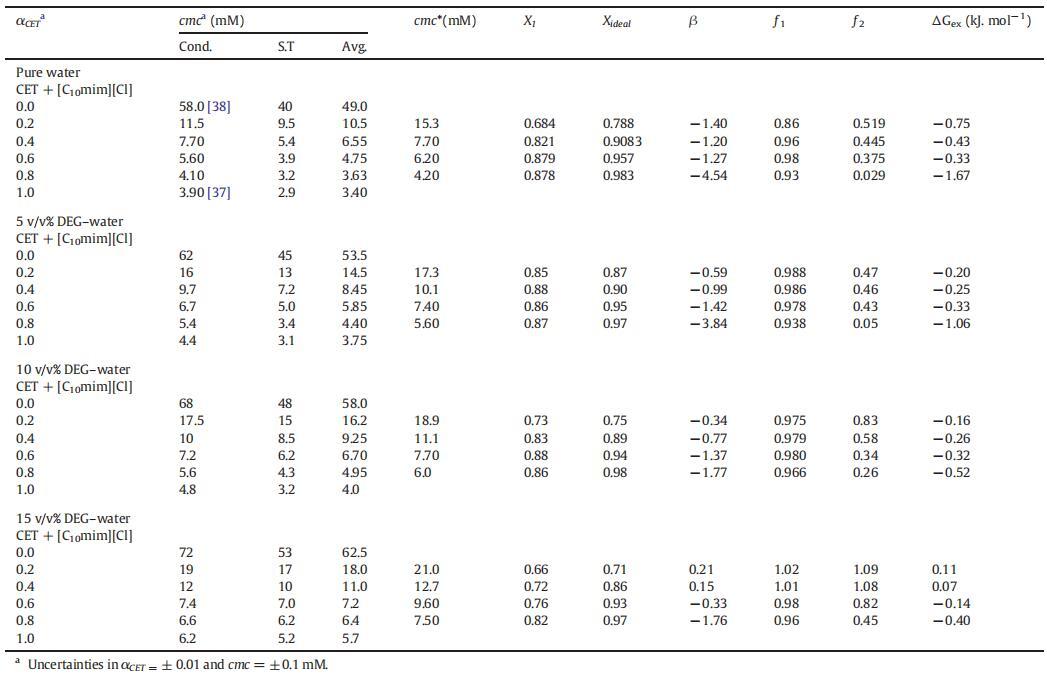表1(cmc)、平均值(cmc)、理想值(cmc*)、膠束組成(X1,Xideal)、相互作用參數(shù)(β)的值,混合物CET+[C10min][Cl]的活度系數(shù)(?1,?2)和混合過(guò)量自由能(ΔGex),作為純水中CET摩爾分?jǐn)?shù)(α)的函數(shù),以及在T=298.15 K時(shí)DEG-水二元混合物的不同體積百分比。