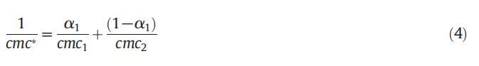 應(yīng)用偽相模型,我們可以計(jì)算二元混合物的理想cmc,該模型基于這樣的假設(shè),即膠束被視為宏觀相,與溶液中相應(yīng)的單體處于平衡狀態(tài)。理想cmc值與單個(gè)cmc相關(guān),可使用Clint公式(4)計(jì)算: