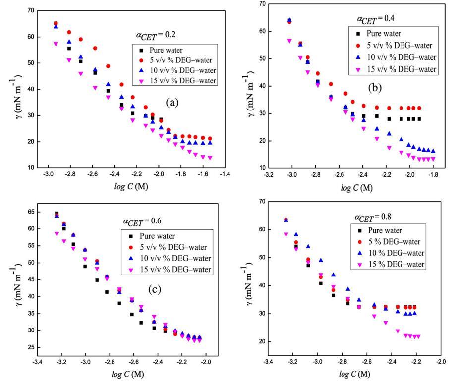 圖2.在T=298.15 K時(shí),二甘醇-水二元混合物的不同體積百分比下,混合體系的表面張力,γ與對(duì)數(shù)[濃度]的關(guān)系曲線,CET+[C10min][Cl](a)αCET=0.2(b)αCET=0.4,(c)αCET=0.6和(d)αCET=0.8。