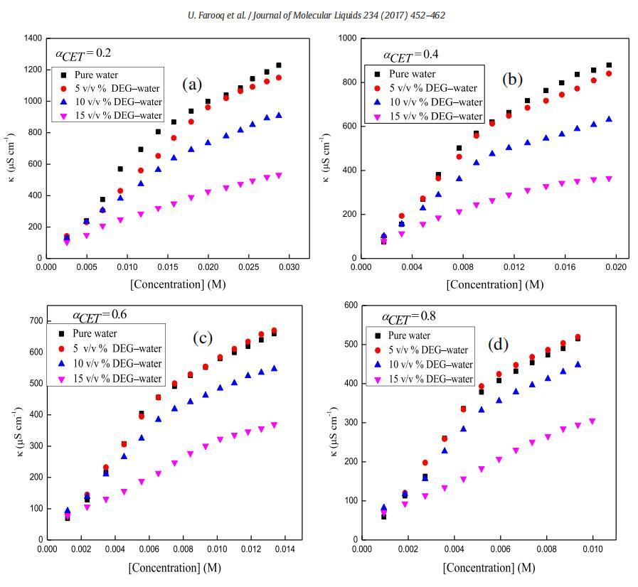 圖1。在T=298.15 K時(shí),二甘醇-水二元混合物的不同體積百分比下,混合體系的比電導(dǎo)率,κ與[濃度]的曲線圖,CET+[C10min][Cl](a)αCET=0.2(b)αCET=0.4(c)αCET=0.6和(d)αCET=0.8。