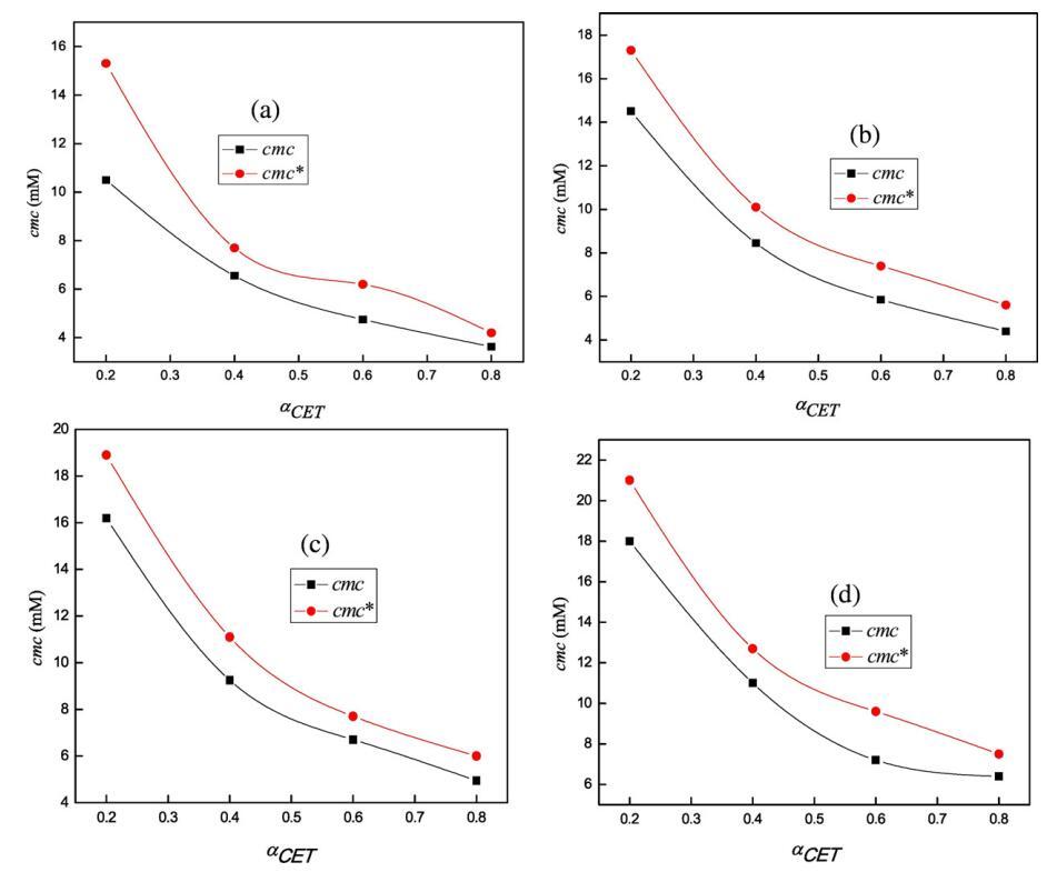 圖4。cmc的變化(■)在298.15 K條件下,在不同體積百分比的二甘醇-水混合物(a)存在于純水中(b)5 v/v%二甘醇-水(c)10 v/v%二甘醇-水和(d)15 v/v%二甘醇-水中時(shí),使用αCET的cmc*()。