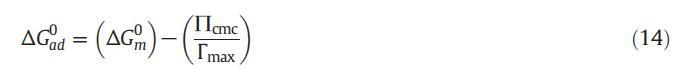 式(14)中的術(shù)語(yǔ)e∏cmcΓmaxT為我們提供了將單層表面壓力為零的兩親分子引入膠束所需的工作信息。ΔGm0和ΔGad 0的值均為負(fù)值,表明這兩個(gè)過(guò)程都是有利的,但是ΔGad 0的值比ΔGm0的值更為負(fù),這表明所有這些系統(tǒng)的吸附過(guò)程比膠束形成過(guò)程更為有利。