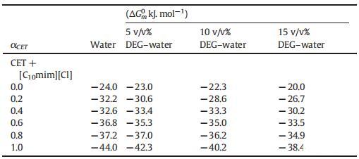 表3:在T=298.15 K時(shí),CET+[C10min][Cl]混合物在純水以及不同體積百分比的二甘醇-水二元混合物中的膠束化標(biāo)準(zhǔn)吉布斯自由能(ΔGm0)值。