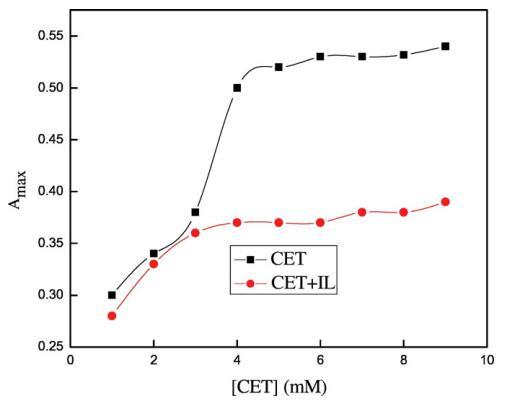 圖6.含水鉻峰的最大吸光度與[CET]的變化(■)在沒(méi)有ILs和()的情況下,存在0.05 w/w%的[C10min][Cl]。