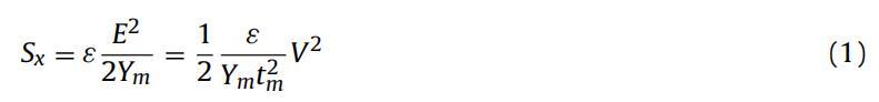 DEA的最大應(yīng)變受到DE擊穿場(chǎng)的限制(更準(zhǔn)確地說(shuō),DEA的失效模式是機(jī)電不穩(wěn)定性[13],但擊穿場(chǎng)是小應(yīng)變致動(dòng)器配置的關(guān)鍵限制因素)。對(duì)于厚度為10μm至100μm的典型彈性體,以及在100–150V/μm的典型彈性體擊穿場(chǎng)附近工作,DEA需要1kV至15kV以達(dá)到最大應(yīng)變。由于高壓電子設(shè)備的成本、尺寸和效率,這些高工作電壓限制了DEA的一些可能應(yīng)用。因此,為了降低DEA的工作電壓,同時(shí)保持相同的驅(qū)動(dòng)性能,進(jìn)行了大量的研究。從式(1)中可以看出,為了在降低電壓的同時(shí)保持給定的驅(qū)動(dòng)應(yīng)變,ε必須增加[9,14],或者Ym和tm必須減少[15,16]。應(yīng)變電壓平方比(Sx/V2)指標(biāo)已用于比較不同工作電壓下DEA的性能[16]。對(duì)于厚度為3μm的DEA,降低膜厚度tm導(dǎo)致先前報(bào)告的最高Sx/V2值為125%/kV2,在245V下產(chǎn)生7.5%的線(xiàn)性應(yīng)變[16]??紤]到電極通常比彈性體更硬(對(duì)于DEAs中使用的幾乎所有材料,Ye>Ym),當(dāng)膜變薄時(shí),電極厚度te或電極剛度Ye也必須進(jìn)一步減小,以保持驅(qū)動(dòng)應(yīng)變,如式(2)所示。