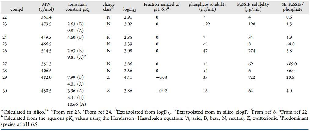 以前曾使用一組參考化合物觀察到,電離酸性化合物的硒通常低于電離堿。結(jié)果表明,由于與帶負電荷的FaSSIF介質(zhì)組分之間的靜電排斥作用,離子酸在FaSSIF中的溶解度沒有增加。8在目前的研究中,對于幾個涵蓋更廣泛化學(xué)空間的專利化合物,我們沒有發(fā)現(xiàn)離子化酸或堿之間硒的任何顯著溶解度差異,這表明靜電相互作用可能被其他因素掩蓋或覆蓋,如化合物的構(gòu)象和親油性。