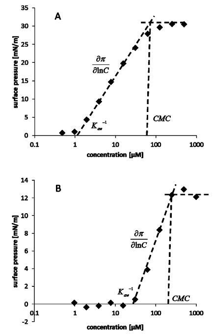 表面活性參數(shù)的測定。表面活性劑的主要參數(shù)由濃度-表面壓力曲線獲得。圖3中描述了代表性化合物的這些參數(shù),表2中總結(jié)了完整的數(shù)據(jù)集。