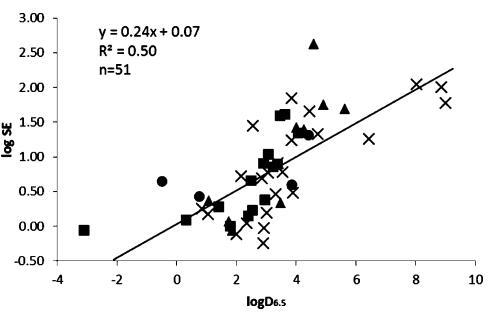 圖2。在pH值為6.5時,51種化合物的溶解度增強(SE=S_-FaSSIF/S_-水溶液)是辛醇/水分配系數(shù)的函數(shù)?;衔锉粴w類為酸(■),基地(▲),中性(×)和兩性離子(●).高于或低于檢測限的值在檢測限處繪制。