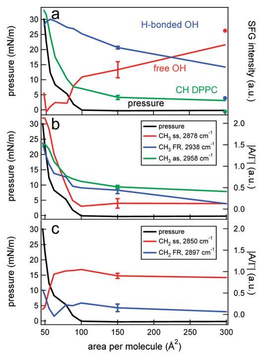 SFG光譜中不同振動的積分SFG強度與圖6a中的表面壓力一起繪制,作為每個分子面積的函數(shù)。CH強度隨著表面DPPC分子數(shù)量的增加而非線性增加。水信號持續(xù)增加,而自由OH信號隨著表面分子數(shù)量的增加而持續(xù)減少,正如預(yù)期的那樣,當(dāng)系統(tǒng)達(dá)到液體膨脹相時,27達(dá)到零值。原則上,在氣相和液相膨脹相的共存區(qū)(如上~每個分子100?2),人們可能會看到波動的SFG信號,因為氣相不發(fā)出信號,而液相膨脹相發(fā)出信號。用二次諧波發(fā)生器28和橢偏儀觀察到了這種波動信號。29然而,此處未觀察到這些波動,因為呈現(xiàn)的SFG光譜平均超過10分鐘,這在磁疇擴散的時間尺度上很長,發(fā)生在數(shù)十秒的時間尺度上。28,29