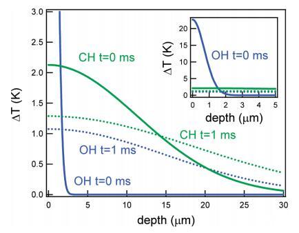 圖9。對于與CH(綠色)或OH(藍(lán)色)振動共振的紅外光束,溫度隨著進入水層的深度而升高。實線和虛線分別表示t=0和t=1 ms。插圖顯示了相同的圖形,但帶有擴展的yaxis。