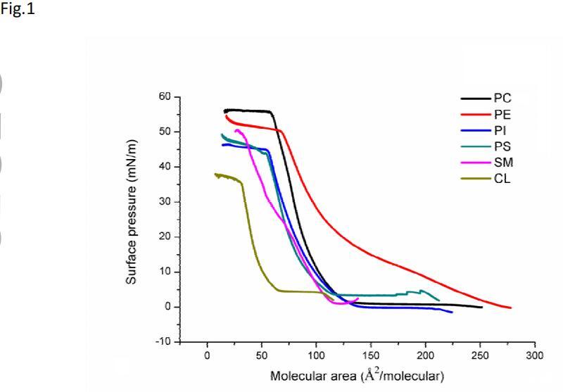圖1顯示了空氣-水界面上不同磷脂單層的π-A曲線形狀。這里測(cè)試的所有磷脂的π-A曲線的形狀都是在所有顯示的表面壓力下單一液體膨脹(LE)和液體冷凝(LC)狀態(tài)的特征。在壓縮時(shí),單層經(jīng)歷了一個(gè)轉(zhuǎn)變,這被視為從LE(低于10 mN/m)到LC狀態(tài)的轉(zhuǎn)變。在高分子區(qū)域,由于分子堆積的增加,表面壓力升高,但不改變單層膜的彈性。最后,單分子膜達(dá)到了一種更為濃縮的狀態(tài),但在π-a等溫線的形狀中沒有明顯的崩塌點(diǎn)。對(duì)于這里測(cè)試的磷脂,它們都可以形成穩(wěn)定的膜,并表現(xiàn)出良好的壓縮性能,DOPC的表面壓力甚至達(dá)到57 mN/m。
