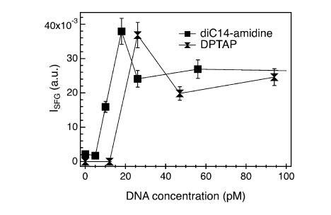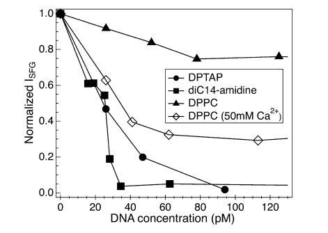 圖7(上圖)所示的壓縮等溫線清楚地表明,DNA對(duì)diC14氨基單層膜的影響,在很大的密度范圍內(nèi),是增加表面壓力,或等效地降低表面張力。也就是說,加入DNA后,表面生成的自由能總是變得更有利。然而,在沒有進(jìn)一步信息的情況下,這些實(shí)驗(yàn)幾乎無法深入了解表面熱力學(xué)變化的分子基礎(chǔ)。雙14-氨基單分子膜的CH區(qū)域的VSF光譜作為DNA濃度的函數(shù),以及由此產(chǎn)生的CH3SS/CH2 SS比率,提供了這樣的見解。如圖7(下圖)所示,向亞相添加DNA,即使在40 pM以下的體積濃度下,也會(huì)導(dǎo)致脂質(zhì)尾部順序的強(qiáng)烈增加。在解釋電子自旋共振研究的結(jié)果時(shí),貝納蒂及其同事曾認(rèn)為,吸附的DNA使凝膠相雙氰胺雙層(低于23°C)流態(tài)化,并使液相雙層(高于23°C)僵化,從而有效地平滑了在沒有DNA的情況下急劇的熱相變。91我們的光學(xué)和壓力等溫線測量都是在略低于熔融溫度的情況下進(jìn)行的。我們的壓縮等溫線表明,DNA的作用是增加表面上單個(gè)鏈之間的相互作用(降低表面張力),而光學(xué)測量表明,鏈相互作用的增加導(dǎo)致脂質(zhì)尾部更有序。有趣的是,這些結(jié)果與這樣一種情況是一致的,即DNA的加入似乎會(huì)產(chǎn)生脂質(zhì),兩者之間的相互作用比沒有DNA時(shí)更強(qiáng)烈,尾巴比沒有DNA時(shí)更有序,鏈的流動(dòng)性增強(qiáng)。這種脂鏈流動(dòng)性和脂鏈順序的解耦類似于之前觀察到的膽固醇和DPPC混合物隨溫度變化的情況。92