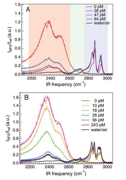 界面水的光譜響應(yīng)。圖2顯示了在2100-3100 cm-1范圍內(nèi),隨著亞相DNA濃度的增加,DPTAP、diC14氨基和DPPC單分子膜的VSF光譜。對(duì)這些數(shù)據(jù)的粗略檢查顯示出幾個(gè)特征。聚焦于圖2面板A,從低頻向高頻移動(dòng),很明顯,有一個(gè)巨大的雙峰結(jié)構(gòu),隨著DNA的加入,其振幅突然降低(透明的紅色矩形);一個(gè)小的、更高頻率的峰值(以≈2675 cm-1),隨著DNA(透明綠色矩形)的加入而增加;在2800-2950 cm-1的頻率范圍內(nèi)有幾個(gè)較窄的峰值(這些峰值是CH拉伸振動(dòng)的結(jié)果,顯示在一個(gè)透明的藍(lán)色矩形中,下面將進(jìn)一步討論)。