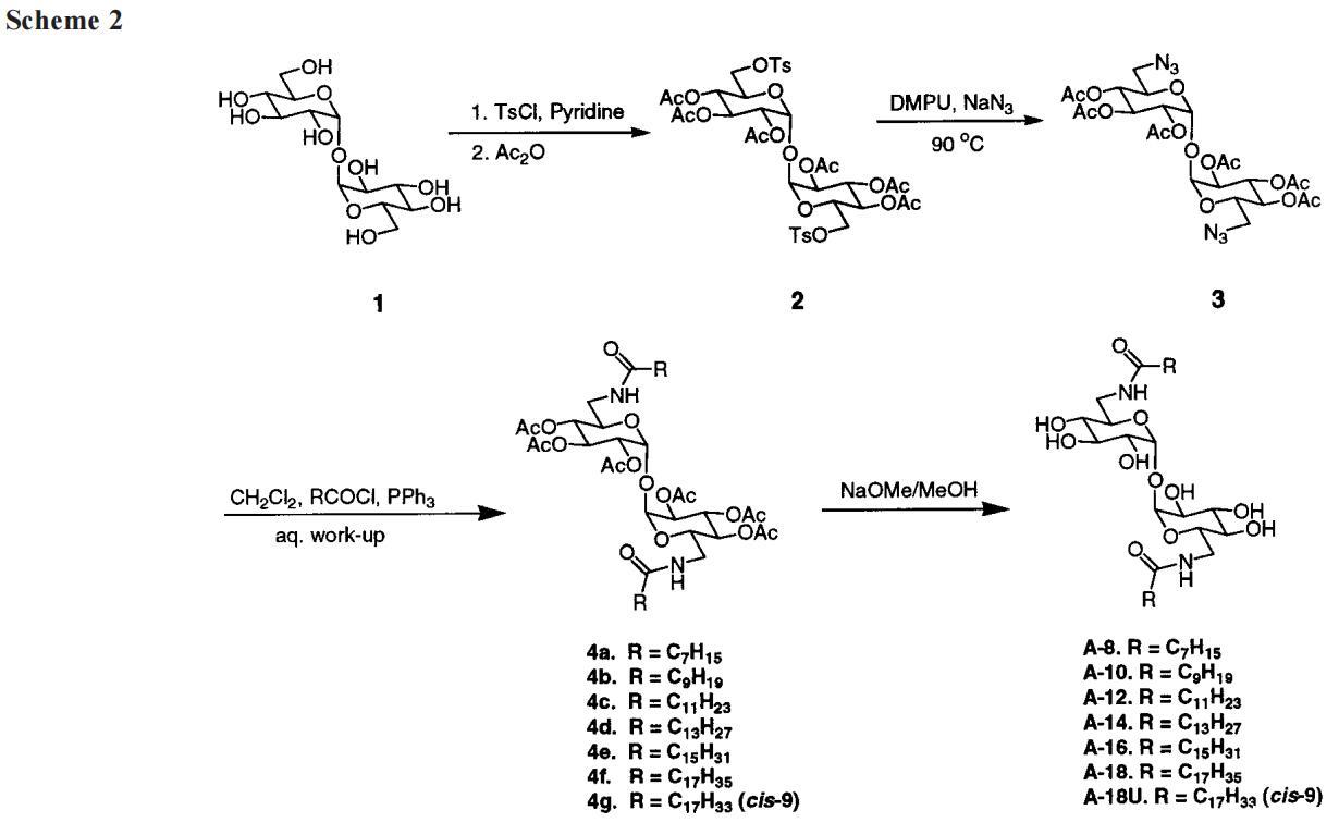 2,3,4,2′,3′,4′-六鄰乙?;?6,6′-二十二酰胺-6,6′-二脫氧-r,r-D-海藻糖,4b。使用2.1 g(3.3 mmol,6.5 mmol當量)3、50 mL CH2Cl2、1.9 mL(9.0 mmol)癸酰氯和2.2 g(8.4 mmol)PPh3在10 mL CH2-Cl2中的溶液進行反應。通過硅膠柱層析純化,得到0.86 g(37%)4b,mp 62-66°C。