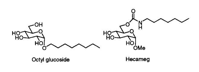 我們的第一個驚喜是發(fā)現(xiàn)A系列海藻糖雙子座不溶于水。例如,A-12、A-14和A-16(指鏈長的數(shù)字)在1毫升溫水中旋轉2毫克時會留下沉淀物。即使在70°C的溫度下,A-10也會在這種處理過程中形成渾濁的懸浮液。A-8在室溫下的可溶濃度僅為1-2 mM(根據(jù)動態(tài)光散射,在該濃度下,會形成膠束大小的聚集體)。天真地說,人們可能會認為a-8的溶解度大得多,因為該分子由六個羥基和兩個酰胺組成。盡管相關的6-氨基-6-脫氧己糖衍生物需要加熱才能溶解,25許多烷基化單糖(例如,辛基葡萄糖苷和甲基6-O-(N-庚基羰基)-R-D-吡喃葡萄糖苷或下面的“Hecameg”)是水溶性的。然而,A-8并沒有類似的天賦。這里的教訓是,用一句老生常談的話來說,我們的雙子座比其各個部分的總和要多(或少)。不管老生常談與否,雙子座的獨特屬性都取決于它。
