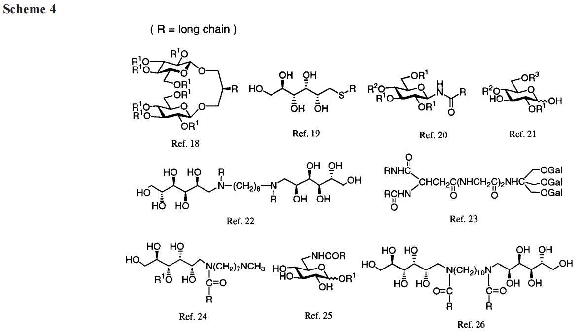 接下來,我們提出了在海藻糖衍生物上放置陽離子基團以改善其水溶性的想法。必須承認,我們對更易管理的水溶性化合物的前景感到一定程度的高興。B系列就這樣出現(xiàn)了。然而,我們立即面臨新的問題。雖然B-12和B-14是作為純化合物獲得的,但B-16和B-18并非如此。后兩種Gemini的產(chǎn)率較低,提供了令人滿意的光譜數(shù)據(jù),但它們的元素分析偏離了理論1-2%(這使我們懷疑存在無機雜質)。無論如何,由于B-16和B-18不符合我們的高純度標準,我們在注意力上輕視了它們,而偏愛它們的矮表親。