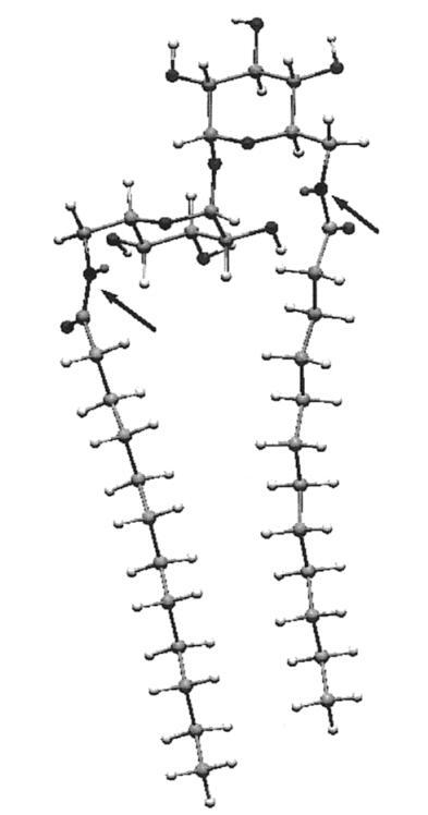 計算首先將海藻糖插入宏模型程序42,并對結構進行琥珀色能量最小化。從使用琥珀色*力場的25000個構象搜索中,我們選擇了能量最低的構象,該構象恰好與報告的X射線結構重疊。43,44接下來,該結構中的6-和6′-羥基被乙酰氨基取代。在模擬的水環(huán)境中,用AMBER*再次進行了25000次構象搜索。然后乙?;皇榛〈缓髮ι傻腶-12雙子座進行了另一次搜索。結果表明,整個構象由酰胺羰基和相鄰葡萄糖環(huán)的2-羥基之間的兩個分子內氫鍵控制。氫鍵導致兩條全反式鏈彼此擺動約95°。A-12的固態(tài)紅外光譜證實了這種相互作用,該光譜顯示1646 cm-1處有羰基帶,而Hecameg的羰基帶為1700 cm-1,單體葡萄糖類似物的羰基帶為1698 cm-1。25由于這種構象會不切實際地排除分子內疏水締合,而且在任何情況下,羰基氫鍵位點的溶劑可能會淹沒在水中,我們故意不允許-CdO氫鍵,并重新計算。通過這種方式,我們得到了圖6??梢钥吹剑粭l鏈上大約有八個碳與其伙伴鏈的碳并排排列。N/N距離僅為7.4?,整體分子形狀為“管狀”。用另一種方式說,糖的頭基延伸的距離不比兩條鏈的寬度大多少,就像人們預期的一種易于堆積成雙層的化合物那樣。45因此,正如前面從實驗數(shù)據(jù)得出的結論,海藻糖更像是一個統(tǒng)一的頭基,而不是一個可以有效隔離鏈的長間隔基。