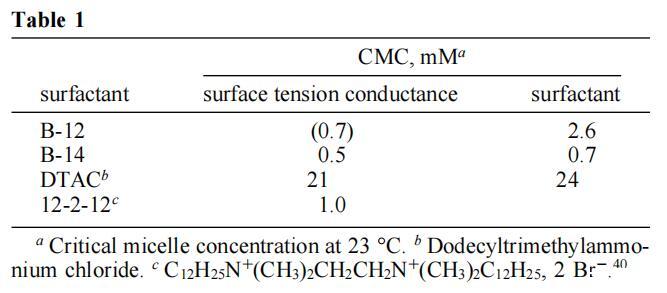B-12和B-14確實是水溶性化合物,在臨界膠束濃度(CMC)以上形成膠束,動態(tài)光散射顯示顆粒大小小于5nm。CMC值是通過表面張力-濃度曲線(圖4)和電導率-濃度曲線(圖5)中的斷裂來確定的。38表1給出了結果數(shù)據(jù)(以及兩種常規(guī)表面活性劑的數(shù)據(jù),用于比較)。如圖所示,B-12的CMC值通過張力測量法和電導測量法(這兩種方法都是可重復的)得出的結果不一致。這種差異至少部分可以追溯到B-12表面張力的時間依賴性。因此,在10分鐘的過程中,B-12水溶液的表面壓力增加了10 mN/m,之后趨于穩(wěn)定。這種動態(tài)表面張力過程(之前已經(jīng)用雙子座表面活性劑觀察到)13,15,39可能與雙子座表面活性劑在空氣/水界面組織方面的困難有關。為了解決這個問題,圖4中的B-12溶液在表面張力測量之前老化20分鐘,從而減少了系統(tǒng)尚未平衡的可能性。盡管采取了這種預防措施,但我們無法確定依賴時間的界面重組是否不會影響B(tài)-12圖,并導致基于張量和電導的數(shù)據(jù)之間的差異。當然,后者來源于不受界面事件影響的大塊特性,因此更可靠。有趣的是,B-14沒有表現(xiàn)出隨時間變化的表面張力,兩種方法確定的CMC值是合理一致的。也許更長的鏈既增強了對空氣/水界面的親和力,也增強了從溶液中吸收界面的動力學。