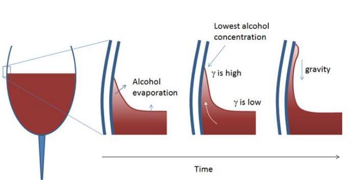 水由于強(qiáng)有力的氫鍵的存在,使得其表面張力極強(qiáng)。正是由于表面張力的存在,因此葡萄酒和杯壁交界處有一個(gè)薄薄的彎月面,它的存在加上表面乙醇的蒸發(fā),使得此處水的占比較大,因此具有較大的表面張力。而酒內(nèi)部的乙醇濃度較高,表面張力較小,因此與彎月面處形成了一個(gè)表面張力梯度,從而內(nèi)部的酒逐漸向彎月面移動(dòng),彎月面處的酒逐漸變多,逐步形成一個(gè)個(gè)小酒滴。但當(dāng)酒滴大到一定程度時(shí),由于重力作用,它便會(huì)滴下來(lái),這就是“酒淚”現(xiàn)象了。