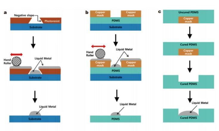 除了某些特定材料的表面(金、銅、錫等)可以潤濕外,使用施加電壓等方法也可以改變液態(tài)金屬的潤濕特性,使其在基材表面擴(kuò)散,在此基礎(chǔ)上可以制造出可拉伸的電子設(shè)備。