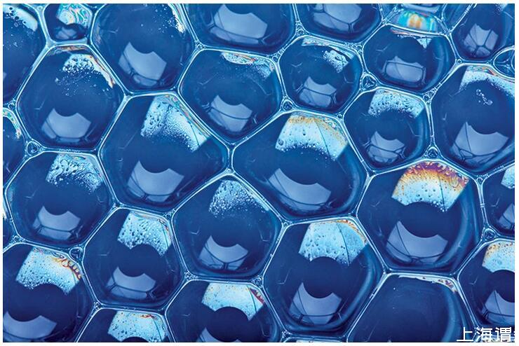 單層的“泡泡筏”由大多數(shù)六邊形(不一定是正六邊形)的泡泡組成。有一些“缺陷”泡泡可能有五面或七面。但三邊相交,角度約為120°。圖源:Shebeko/Shutterstock