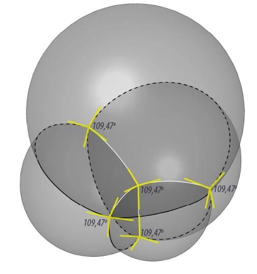 如果我們從平面的泡泡筏推演到立體的“泡泡堆”,結(jié)果也是類似的。假如你用吸管對著一碗肥皂水吹氣,吹起一堆泡沫,你會看到,當(dāng)泡泡堆積在一起之后,它們四面邊界相交于一個點(diǎn),夾角約為109°——沒錯,這個角度就是正四面體中心到各頂點(diǎn)連線的夾角。