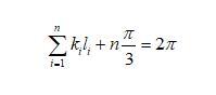 假設(shè)二維干泡沫中的任一氣泡如圖3b所示,氣泡的邊數(shù)為n,從a點(diǎn)開始,再回到a的邊長(zhǎng)分別標(biāo)記為l1到ln,每邊所對(duì)應(yīng)的曲率為k1到kn(Plateau第一定律)?,F(xiàn)在假設(shè)有一點(diǎn)從a點(diǎn)沿著邊向b運(yùn)動(dòng),到b點(diǎn)時(shí),所走的路徑為l1,轉(zhuǎn)動(dòng)的角度為這條邊所對(duì)應(yīng)的圓心角(向外為正,向內(nèi)為負(fù)值),為k1*l1。此時(shí)要想繼續(xù)沿著邊運(yùn)動(dòng),需要向內(nèi)轉(zhuǎn)動(dòng)π/3角度(根據(jù)Plateau第二定律),如圖3b所示。轉(zhuǎn)動(dòng)后繼續(xù)運(yùn)動(dòng),直到到達(dá)原來(lái)的點(diǎn)a。此過(guò)程,n條邊總共在頂點(diǎn)處轉(zhuǎn)動(dòng)的角度為nπ/3,在邊上轉(zhuǎn)動(dòng)的角度為