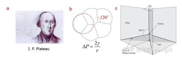 泡沫物理學(xué)集中于研究泡沫的結(jié)構(gòu)、靜力學(xué)、動(dòng)態(tài)演變及排液等內(nèi)容。它是一個(gè)十分古老的學(xué)科,由比利時(shí)物理學(xué)家Plateau在19世紀(jì)中葉開創(chuàng)(圖2a)。Plateau在數(shù)十年的失明的時(shí)光里,依舊通過(guò)指導(dǎo)他侄子做試驗(yàn),堅(jiān)持研究肥皂泡薄膜的幾何形態(tài)及其背后隱藏的力學(xué)規(guī)律。1873年,他和侄子把自己的實(shí)驗(yàn)現(xiàn)象和分析結(jié)果做了系統(tǒng)整理,以法文發(fā)表,從此把對(duì)泡沫結(jié)構(gòu)的研究由定性印象推到了量化階段,開創(chuàng)了泡沫物理學(xué)(Ref 2)。在泡沫靜力學(xué)方面,Plateau的主要貢獻(xiàn)在于其提出了干泡沫的靜態(tài)結(jié)構(gòu)力學(xué)的三定律,它是后續(xù)泡沫研究的基石: