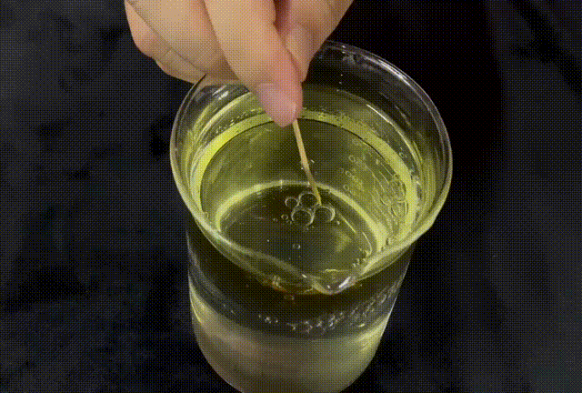 不過如果我們用牙簽去破壞這個(gè)界面,小水球就會(huì)“合成”大水球,或者如果去破壞水球與下方水面之間的油膜的話,水球就會(huì)破裂、流入燒杯底部。