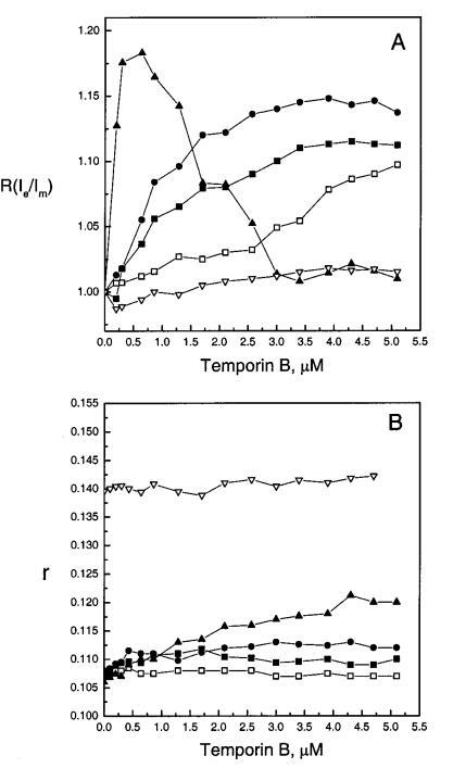 圖3:通過(guò)芘標(biāo)記的磷脂PPDPC(X)0.01)的熒光和DPH(X)0.002的穩(wěn)態(tài)發(fā)射各向異性r評(píng)估顳葉素B對(duì)LUV中脂質(zhì)動(dòng)力學(xué)的影響,顯示為具有XPOPG)0(0)、0.10(9)、0.20(B)和0.40(2)的SOPC脂質(zhì)體中歸一化準(zhǔn)分子與單體比率r(Ie/Im)(圖A)和各向異性r(圖B)的變化,Xchol)0.10(3)。每個(gè)數(shù)據(jù)點(diǎn)代表三次測(cè)量的平均值。標(biāo)準(zhǔn)偏差小于0.02(面板A)和0.004(面板B),為清楚起見(jiàn),未顯示。否則情況如圖2圖例所示。