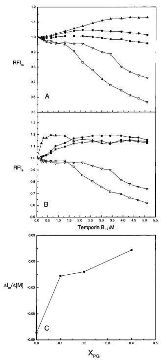 顳蛋白對(duì)雙層脂質(zhì)動(dòng)力學(xué)的影響。隨后通過(guò)記錄摻入LUVs的芘標(biāo)記熒光磷脂類似物PPDPC(X)0.01)的發(fā)射光譜來(lái)研究肽與脂質(zhì)體結(jié)合的后果。對(duì)于含有脂質(zhì)類似物(如PPDPC)的單個(gè)芘部分,穩(wěn)態(tài)Ie/Im值反映了膜中熒光團(tuán)的橫向遷移率和局部濃度(18,19)。然而,我們之前的研究比較了兩種其他抗菌肽(馬蓋寧2和吲哚肽)對(duì)膜脂質(zhì)動(dòng)力學(xué)的影響,發(fā)現(xiàn)這些肽也影響芘標(biāo)記脂質(zhì)的量子產(chǎn)率(15)。對(duì)于SOPC LUV,添加temporin B分別導(dǎo)致芘單體和準(zhǔn)分子發(fā)射Im和Ie的顯著減少,最大減少約40%(圖2,面板a和B)。芘熒光帶的猝滅是雙相的,當(dāng)時(shí)間蛋白B與脂質(zhì)的摩爾比約為1:12時(shí),量子產(chǎn)率顯著降低(圖2,面板a和B)。在膽固醇(Xchol)0.10)存在的情況下,temporin B對(duì)芘單體和準(zhǔn)分子熒光的猝滅也很明顯,盡管發(fā)射的減少量小于在SOPC LUV中觀察到的減少量(圖2,面板A和B)。然而,當(dāng)酸性磷脂POPG存在于XPOPG)0.10時(shí),Im中只有微不足道的變化是明顯的,當(dāng)XPOPG從0.20增加到0.40時(shí),時(shí)間蛋白B導(dǎo)致Im以漸進(jìn)的方式增加,Im的初始增量在大約2/1的POPG/時(shí)間蛋白B化學(xué)計(jì)量比下趨于穩(wěn)定。在達(dá)到飽和響應(yīng)之前,Im中線性增量的斜率隨著XPOPG而增加(圖2,面板C)。在POPG存在的情況下,顳蛋白B也增加了Ie。在XPOPG)0.40時(shí),Ie的值逐漸增加,直到顳蛋白B:脂質(zhì)摩爾比為≈1:15,對(duì)應(yīng)于≈1/6,而當(dāng)超過(guò)該化學(xué)計(jì)量比時(shí),Ie降低。圖3,面板A中顯示了由于顳蛋白B引起的Ie/Im的變化。具體而言,SOPC LUV的Ie/Im增加了1.1倍,而在膽固醇(Xchol)0.10的存在下,觀察到Ie/Im的微小變化,面板A)。將XPOPG從0.10增加到0.20會(huì)逐漸增強(qiáng)Ie/Im的增量。有趣的是,在XPOPG)0.40時(shí),當(dāng)時(shí)間蛋白B:脂質(zhì)摩爾比為≈1:30.然而,在這一肽:脂比之上,顳葉素B導(dǎo)致Ie/Im降低,而在這一肽:脂比之上,Ie/Im的變化不顯著≈1:6.