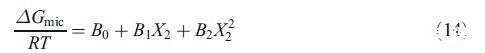 通過使用等式16,可獲得參數(shù)B2,隨后可從等式17獲得B1。表2顯示了B0、B1和B2的值。本混合系統(tǒng)報告的B1值為?7.91.B1的大負(fù)值表明烴鏈-鏈相互作用對混合膠束的穩(wěn)定性也起著重要作用。Maeda還報告了不同二元混合物的負(fù)和正B1值,并得出結(jié)論,鏈-鏈相互作用和頭部基團(tuán)的空間不相容性是這些變化的原因[21]。根據(jù)等式14和表2的參數(shù),我們評估了膠束形成的自由能(數(shù)據(jù)未顯示)。這些評估值接近從偽相分離模型獲得的值(表1)。