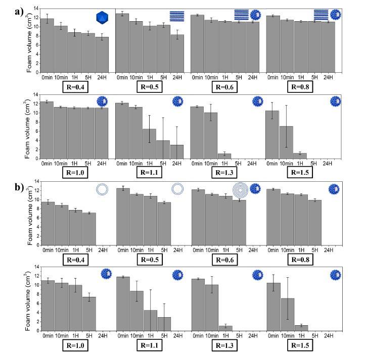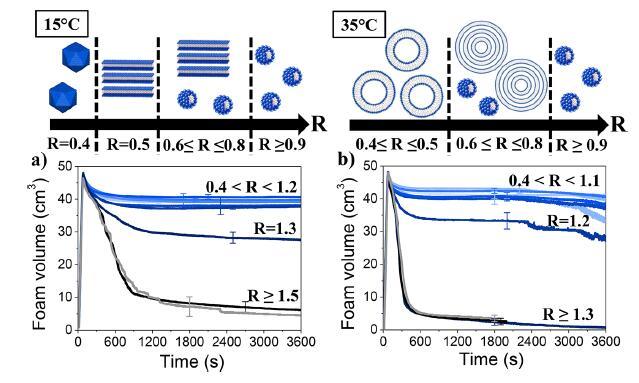 圖5:在兩種溫度下(a)15°C和(b)35°C下,通過(guò)手搖動(dòng)不同摩爾比(R)產(chǎn)生的泡沫體積隨時(shí)間的變化。示意圖表示作為R和溫度的函數(shù)的大量自組裝體。