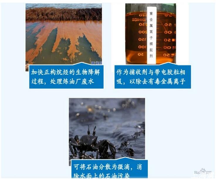 鼠李糖脂可用于處理多環(huán)芳烴PAHs(如:應(yīng)用于墨西哥灣漏油事故中釋放出來的多環(huán)芳香族碳?xì)浠衔铮?,用于處理水體中難生物降解COD,處理重金屬污染等。鼠李糖脂可以修復(fù)人類所造成的環(huán)境污染,包括土壤、水、海岸線及海底中的油、金屬或其他污染物。