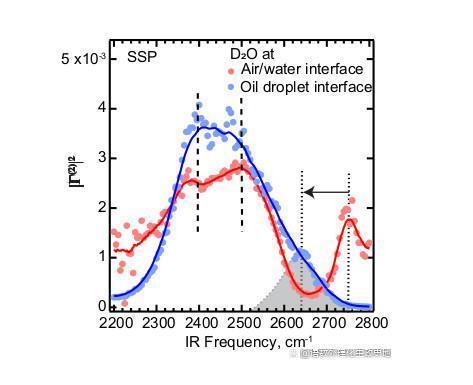 下圖顯示了分散的十二烷油滴(藍色圓圈)和空氣-水界面(紅色圓圈)的界面水(DO)光譜。(使用重水穩(wěn)定了實驗條件,并將運行時間減少了約40%。)水分子的振動頻率偏移部分取決于與相鄰分子氫鍵的強度。2400 cm^-1和2500 cm^-1處的垂直虛線標(biāo)記了氫鍵影響水的氧-氘鍵的頻率邊界。兩個接口的峰值頻率范圍大致相同。
