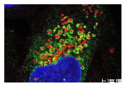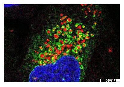 熒光顯微圖像顯示了內(nèi)質(zhì)網(wǎng)(綠色)像毯子一樣包裹住受損的溶酶體(紅色),細胞核以藍色顯示。