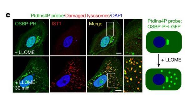 首先,研究者用生物素對溶酶體表面的所有蛋白進行了標記,然后通過組學(xué)方法來尋找溶酶體受損后,表面特異性富集的蛋白。此研究發(fā)現(xiàn),溶酶體一旦受損,在短短幾分鐘后,一種叫PI4K2A的激酶就會到達現(xiàn)場,隨后導(dǎo)致脂質(zhì)信號PI4P(磷脂酰肌醇4-磷酸)大量富集于溶酶體表面。