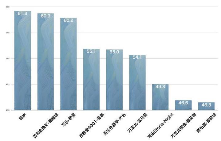 1.達(dá)到60mm接近純水的【高流動(dòng)性組】,代表樣本為【百利金逸彩橄欖綠】、【寫(xiě)樂(lè)極黑】;
