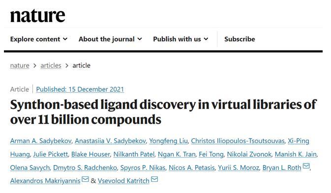 2021年12月15日,美國南加州大學(xué)、東北大學(xué)和北卡羅來納大學(xué)教堂山分校的研究團(tuán)隊(duì)合作,在Nature發(fā)表了題為:Synthon-based ligand discovery in virtual libraries of over 11 billion compounds的研究論文。