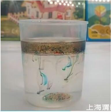 解密時(shí)刻:水不溶于油且水比油重,顏料在油中會(huì)下沉,下沉到水油交界面時(shí),顏料溶于水中,于是就看到了彩虹雨。