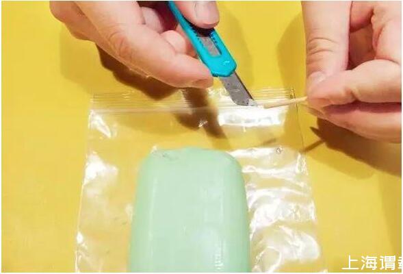 3.用小刀在肥皂刮下一小塊,將刮下的肥皂嵌入劈開的牙簽中。