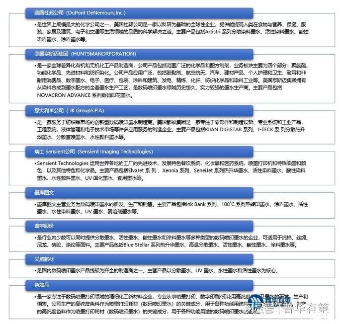 數(shù)碼噴印墨水市場呈現(xiàn)與數(shù)碼印花設(shè)備市場相近的市場競爭格局,由海外巨頭主導市場,如美國杜邦公司、美國亨斯邁集團、意大利JK公司等。從全球范圍來看,目前歐洲、北美地區(qū)的數(shù)碼噴印技術(shù)仍處于較高水平,是率先對數(shù)碼噴墨印花技術(shù)實現(xiàn)產(chǎn)業(yè)化的地區(qū),受益于較高的環(huán)保標準和豐富的時尚原創(chuàng)設(shè)計產(chǎn)業(yè),歐洲、北美地區(qū)的數(shù)碼印花產(chǎn)品供需旺盛,數(shù)碼噴印應用產(chǎn)業(yè)規(guī)模大且普及程度高,全球領(lǐng)先的數(shù)碼噴印墨水制造商多集中于此,亞太地區(qū)則以日本、韓國制造商為主。我國的數(shù)碼噴印墨水行業(yè)起步較晚,企業(yè)規(guī)模、研發(fā)能力以及產(chǎn)品穩(wěn)定性等方面參差不齊,且主要以中小型企業(yè)為主,但隨著最近幾年國產(chǎn)數(shù)碼噴印墨水的快速發(fā)展,我國也出現(xiàn)了少數(shù)綜合實力相對較強的專業(yè)生產(chǎn)商。國內(nèi)外主要墨水生產(chǎn)商情況如下: