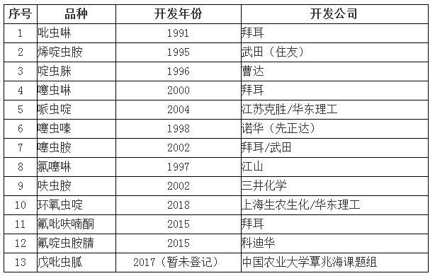 目前,在全球范圍內(nèi)開發(fā)或已使用的新煙堿類農(nóng)藥主要有13種,詳細信息見表1。