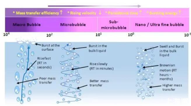 雖然氣泡的研究歷史已經(jīng)超過(guò)半個(gè)世紀(jì),但是氣泡的類型和分類一直存在爭(zhēng)議。學(xué)術(shù)上對(duì)氣泡分類主要根據(jù)氣泡性質(zhì)的不同,最常用的指標(biāo)是氣泡大小、表面特征和氣泡壽命。這些特征主要決定于氣泡大小,因此許多學(xué)者把氣泡大小作為唯一分類標(biāo)準(zhǔn)。按照這個(gè)標(biāo)準(zhǔn),氣泡被分為大氣泡、微米氣泡、亞微米氣泡或納米氣泡,也有采用更通俗分類為大氣泡、小氣泡和超小氣泡。雖然學(xué)者們對(duì)氣泡的大小范圍具體有不同看法,但大多數(shù)同意微氣泡直徑應(yīng)該在10-100微米的范圍,1-10微米為亞微米氣泡,10-1000納米為納米氣泡。