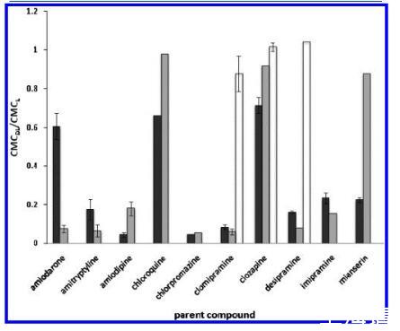 圖5.CMC偏移(由CMC之間的比率表示)藥物-脂質(zhì)復(fù)合物(DL)和單獨(dú)脂質(zhì)的CMC(L):CMCDL/CMCL)的測(cè)試化合物(黑色)及其主要代謝物(灰色、初級(jí)代謝物;白色,次生代謝物)在pH 7.2中分析HEPES緩沖液。使用的藥物濃度為1 mM,除非另有說(shuō)明見(jiàn)表2。誤差線被分配給那些n g3測(cè)試的化合物。對(duì)于氯氮平和米安色林,均為0.91和0.091 mM用于測(cè)試,但僅來(lái)自1 mM測(cè)試的數(shù)據(jù)被策劃。