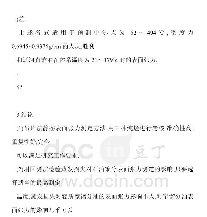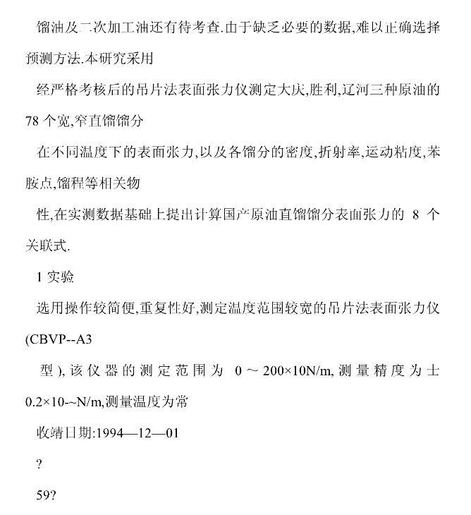 【摘要】:確定并建立了石油餾分靜態(tài)表面張力的測定方法,并用吊片法表面張力儀及三種純烴考核了儀器的準確性,建立了回測法以考核試樣蒸發(fā)損失的影響。實側(cè)了大慶、勝利和遼河三種原油直餾餾分在不同溫度下的表面張力及相關(guān)特性。提出兩類實用范圍不同的預(yù)測國產(chǎn)石油餾分表面張力關(guān)聯(lián)式,其平均相對偏差分別為1.17%~1.26%和1.77%~2.77%,可滿足一般工藝要求。